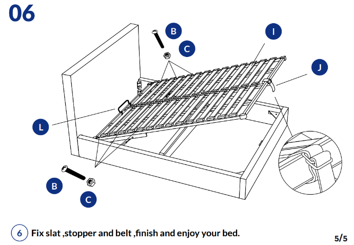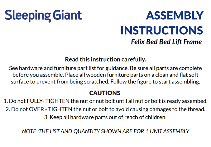 Before assembling your Felix Gas Lift, check that all parts, hardware, and tools are included. Place components on a soft, clean surface to prevent damage. Attach the headboard, footboard, and side rails using the supplied fixings. Install the lift mechanism and central support beam according to instructions, ensuring smooth operation. Secure all bolts firmly without over-tightening. Place and lock the slats into position. Double-check all connections before attaching the mattress. Your Felix Gas Lift bed is now ready for safe use.
