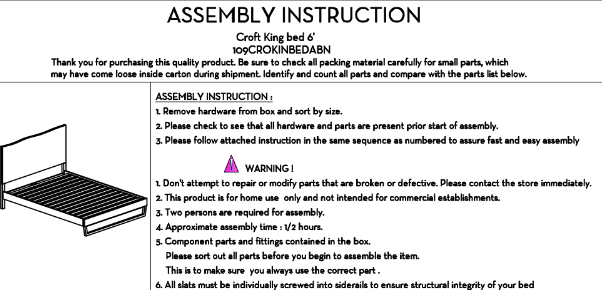 Before beginning assembly of your Croft King Bed, ensure all parts, fittings, and tools are included. Place components on a clean, soft surface to prevent damage. Attach the headboard and footboard of the Croft King Bed to the side rails using the supplied fixings. Install the central support beam, if applicable, for added stability. Secure all fittings firmly without over-tightening. Evenly position and secure the slats across the frame. Check all connections before placing the mattress. Your Croft King Bed is now ready for use.