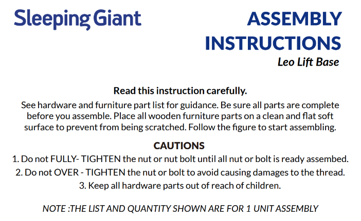 Before assembling your Leo Lift Base, check that all parts, hardware, and tools are included. Place components on a soft, clean surface to prevent damage. Secure all bolts firmly without over-tightening. Place and lock the slats into position. Double-check all connections before attaching the mattress. Your Leo Lift Base lift bed is now ready for safe use.