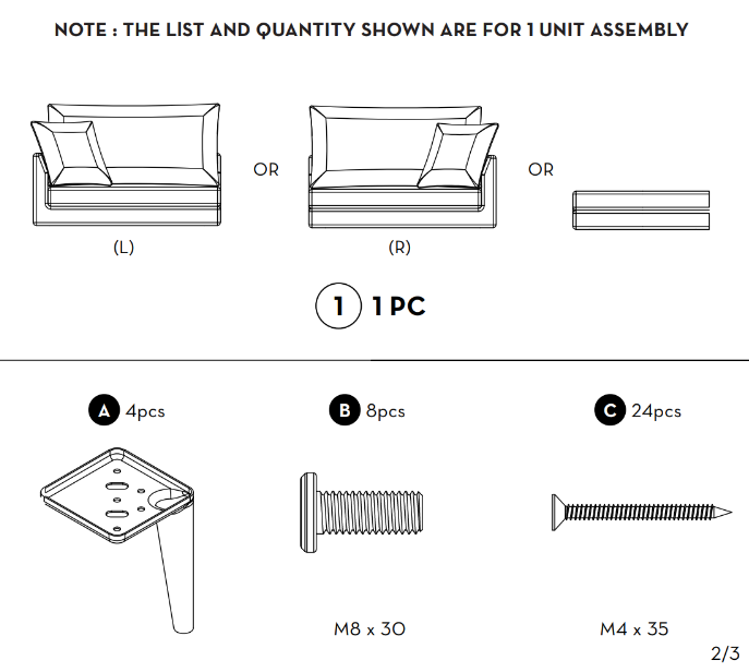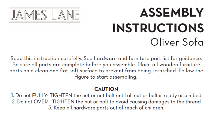 Before assembling your Oliver Sofa, check that all parts, cushions, and hardware are included. Place components on a soft surface to prevent scratches. Attach the legs or base, then connect the arms, backrest, and seat units (if applicable) using the supplied bolts and washers. Ensure all fixings are secure but do not over-tighten. Add any loose cushions or supports as instructed. Double-check stability before use. Your Oliver Sofa is now ready to enjoy.
