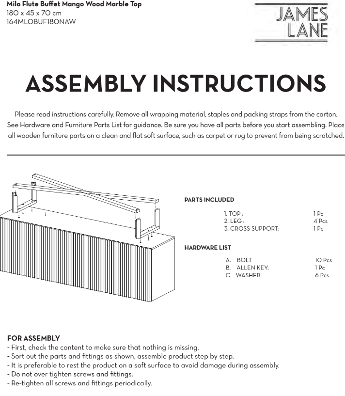 Before assembling your Milo Buffet, check that all parts, drawers, and hardware are included. Place components on a soft, clean surface. Connect the side panels, base, and top using the supplied fixings. Install internal shelves or drawers following instructions, ensuring smooth operation. Secure all bolts firmly but avoid over-tightening. Check that the buffet is level and stable. Your Milo Buffet is now ready for use and display.