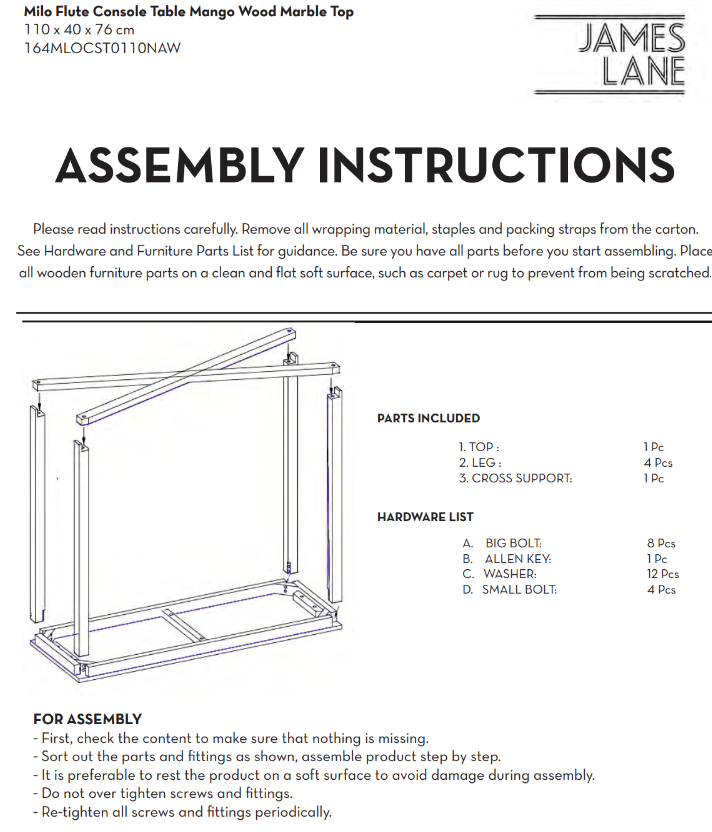 Before assembling your Milo Console Table, ensure all parts, fittings, and tools are available. Place components on a soft surface to prevent scratches. Attach the legs or base to the tabletop using the supplied hardware. Install any additional support beams or braces as instructed. Secure all fixings firmly but do not over-tighten. Check the console is stable and level before use. Your Milo Console Table is now ready for display and use.
