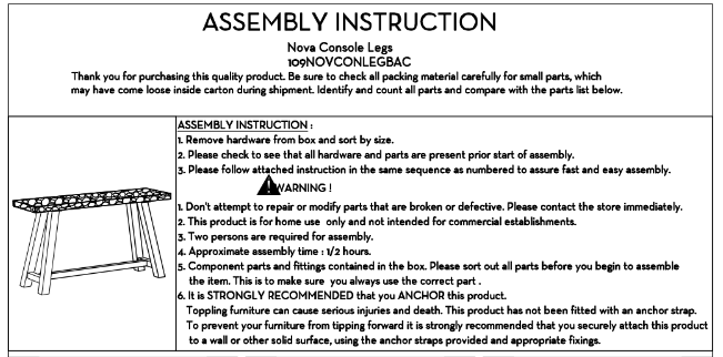 Before assembling your Nova Console, ensure all parts, fittings, and tools are available. Place components on a soft surface to prevent scratches. Attach the legs or base to the tabletop using the supplied hardware. Install any additional support beams or braces as instructed. Secure all fixings firmly but do not over-tighten. Check the console is stable and level before use. Your Nova Console is now ready for display and use.