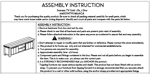 Before assembling your Somara TV Unit, ensure all parts, shelves, and fittings are included. Place components on a soft, clean surface to avoid damage. Attach the side panels, base, and back panel using the supplied bolts and washers. Install any central support beams or shelving according to instructions. Tighten all fixings securely without over-tightening. Ensure the unit is level and stable before placing the TV. Your Somara TV Unit is now ready for use.